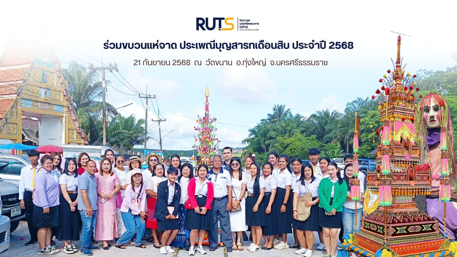 วันที่ 21 กันยายน 2568 มทร.ศรีวิชัย ทุ่งใหญ่ นำโดย อาจารย์สมชาย เรืองสว่าง ผู้ช่วยอธิการบดีประจำวิทยาเขตนครศรีธรรมราช ผศ.ดร.อวยพร วงศ์กูล ผู้อำนวยการสำนักงานวิทยาเขตนครศรีธรรมราช พร้อมด้วย บุคลากรและนักศึกษา ร่วมขบวนแห่จาด ประเพณีบุญสารทเดือนสิบ จังหวัดนครศรีธรรมราช ประจำปี 2568 ณ วัดขนาน อำเภอทุ่งใหญ่ จังหวัดนครศรีธรรมราช