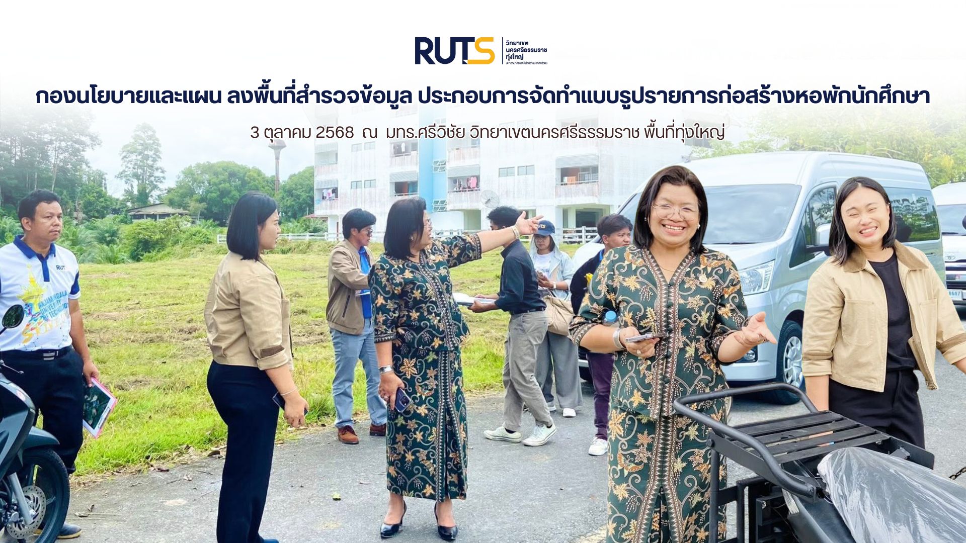 วันที่ 3 ตุลาคม 2568 ผู้ช่วยศาสตราจารย์ ดร.ขวัญหทัย ใจเปี่ยม รองอธิการบดีประจำวิทยาเขตนครศรีธรรมราช และผู้อำนวยการวิทยาเขตนครศรีธรรมราช หัวหน้างาน และบุคลากรที่เกี่ยวข้อง ร่วมกับนางสาววันเพ็ญ จิตตพงศ์ ผู้อำนวยการกองนโยบายและแผน มทร.ศรีวิชัย พร้อมด้วยบุคลากร ลงพื้นที่สำรวจข้อมูล ประกอบการจัดทำแบบรูปรายการก่อสร้างหอพักนักศึกษา พื้นที่นครศรีธรรมราช (ทุ่งใหญ่)