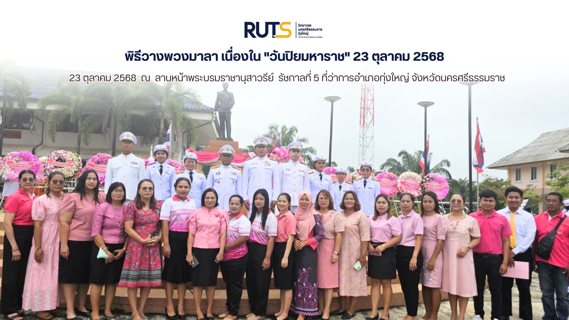 วันที่ 23 ตุลาคม 2568 เนื่องใน “วันปิยมหาราช” มหาวิทยาลัยเทคโนโลยีราชมงคลศรีวิชัย วิทยาเขตนครศรีธรรมราช พื้นที่ทุ่งใหญ่ นำโดย ผู้ช่วยศาสตราจารย์ ดร.อวยพร วงศ์กูล ผู้อำนวยการสำนักงานวิทยาเขตนครศรีธรรมราช คณะผู้บริหาร บุคลากร ตัวแทนนักศึกษา เข้าร่วมพิธีวางพวงมาลาที่ประดับตกแต่งด้วยดอกไม้สีชมพู ซึ่งเป็นสีประจำพระองค์ ภายใต้การจัดพิธีน้อมรำลึกเนื่องในวันคล้ายวันสวรรคต พระบาทสมเด็จพระจุลจอมเกล้าเจ้าอยู่หัว รัชกาลที่ 5