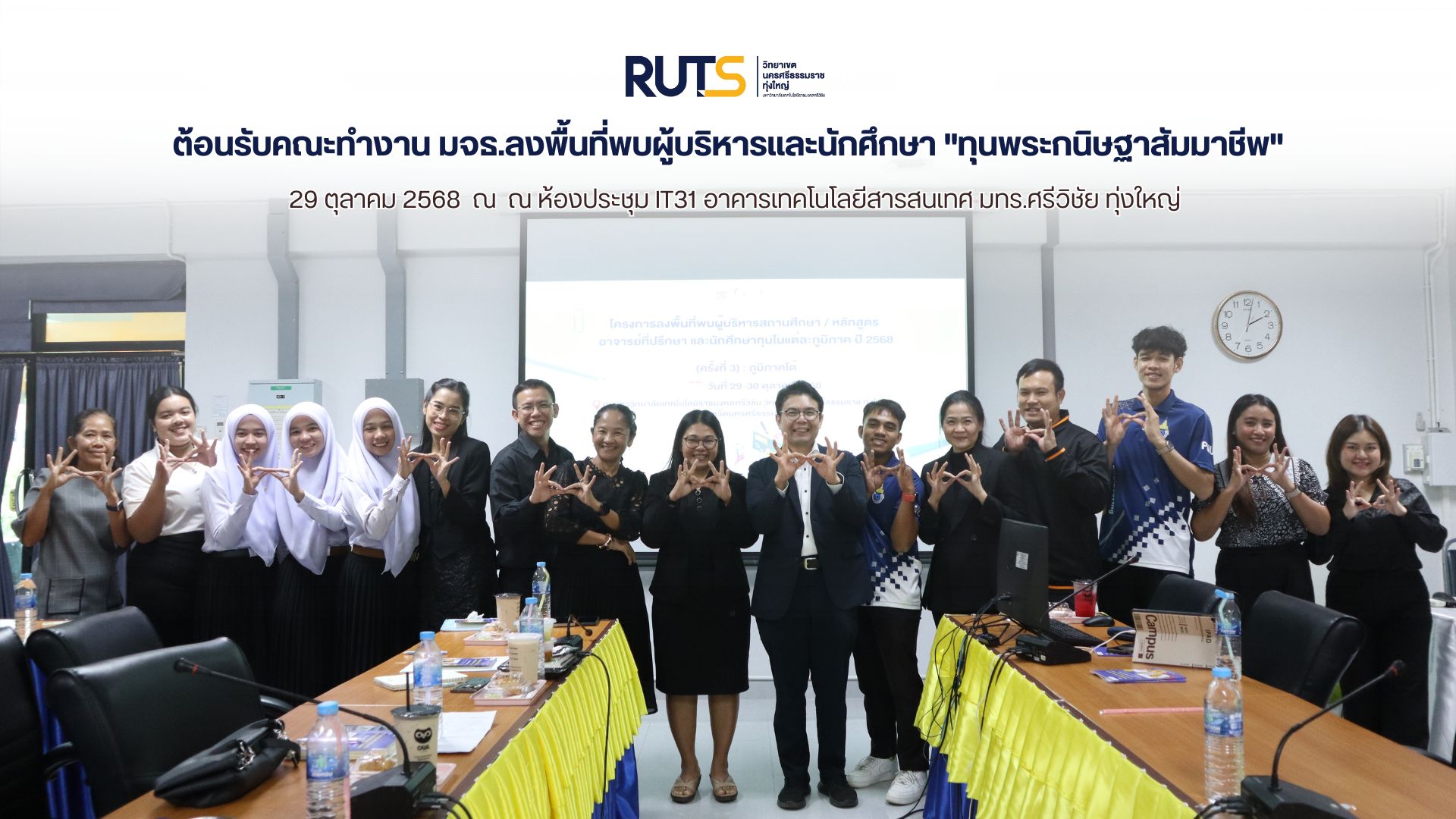 วันที่ 29 ตุลาคม 2568 มทร.ศรีวิชัย ทุ่งใหญ่ นำโดย ผศ.ดร.ขวัญหทัย ใจเปี่ยม รองอธิการบดีประจำวิทยาเขตนครศรีธรรมราช พร้อมด้วย คณะผู้บริหาร คณาจารย์ บุคลากร ร่วมต้อนรับ รศ.ธเนศ ธนิตย์ธีรพันธ์ คณบดีคณะครุศาสตร์อุตสาหกรรมและเทคโนโลยี มหาวิทยาลัยเทคโนโลยีพระจอมเกล้าธนบุรี และในนามหัวหน้าโครงการ พร้อมด้วยคณะทำงาน ในโครงการ “ลงพื้นที่พบผู้บริหารสถานศึกษา/หลักสูตร อาจารย์ที่ปรึกษา และนักศึกษาทุนในแต่ละภูมิภาค” เพื่อสร้างความเข้าใจรายละเอียดทุนและเป้าหมาย บนความร่วมมือในการดูแลและพัฒนานักศึกษาทุนให้เกิดประสิทธิภาพและยั่งยืนมากขึ้น