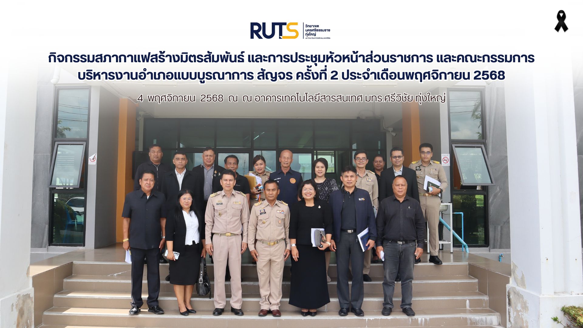 วันที่ 4 พฤศจิกายน 2568 ผศ.ดร.ขวัญหทัย ใจเปี่ยม รองอธิการบดีประจำวิทยาเขตนครศรีธรรมราช พร้อมด้วย คณะผู้บริหาร คณาจารย์และบุคลากร มทร.ศรีวิชัย ทุ่งใหญ่ ร่วมต้อนรับนายมงคล ภักดีสุวรรณ์ นายอำเภอทุ่งใหญ่ พร้อมด้วยหัวหน้าส่วนราชการ ในกิจกรรมสภากาแฟสร้างมิตรสัมพันธ์ และการประชุมหัวหน้าส่วนราชการ และคณะกรรมการบริหารงานอำเภอแบบบูรณาการ สัญจร ครั้งที่ 2 ประจำเดือนพฤศจิกายน 2568 ณ อาคารเทคโนโลยีสารสนเทศ มทร.ศรีวิชัย ทุ่งใหญ่