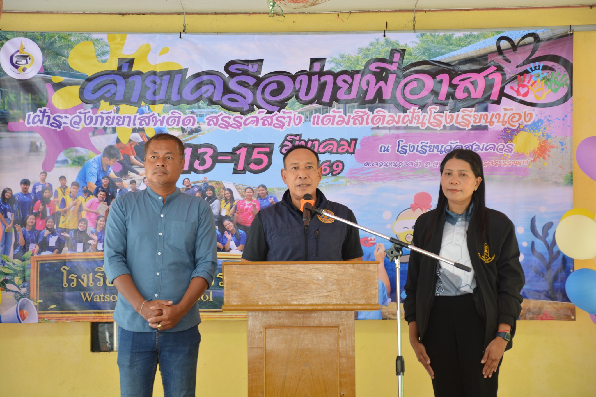 ระหว่างวันที่ 13 – 15 มีนาคม 2569 เครือข่ายสถาบันอุดมศึกษาจังหวัดนครศรีธรรมราช นำโดย ผู้ช่วยศาสตราจารย์ ดร.ขวัญหทัย ใจเปี่ยม ประธานเครือข่ายฯ (รองอธิการบดีประจำวิทยาเขตนครศรีธรรมราช) จัดค่ายเครือข่ายพี่อาสา เฝ้าระวังภัยยาเสพติด สรรค์สร้างแต้มสี เติมฝันในโรงเรียนน้อง ประจำปี 2569 โดยได้รับเกียรติจาก นายธีระยุทธ นาวีเดล นายอำเภอจุฬาภณ์ เป็นประธานในการเปิดโครงการ และ นางสาวปิยาอร ทองนุ่น ผู้อำนวยการโรงเรียนวัดสมควร กล่าวต้อนรับ คณะผู้บริหาร อาจารย์ นักศึกษา บุคลากร ทั้ง 10 สถาบัน ณ โรงเรียนวัดสมควร อ.จุฬาภรณ์ จ.นครศรีธรรมราช
